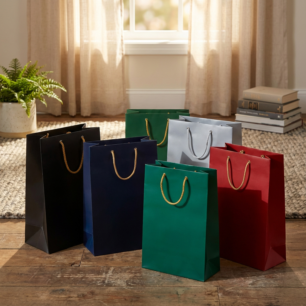 Choice of: Black, Navy, Burgundy, Grey and Green all fitted with gold rope handles and available from stock.